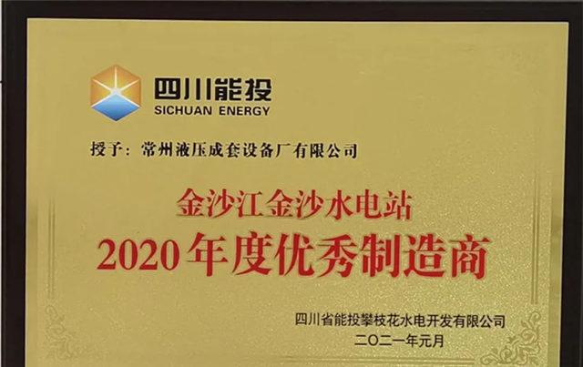 喜訊 | 常州液壓成套設備廠有限公司榮獲“金沙江金沙水電站2020年度優秀制造商”稱號!